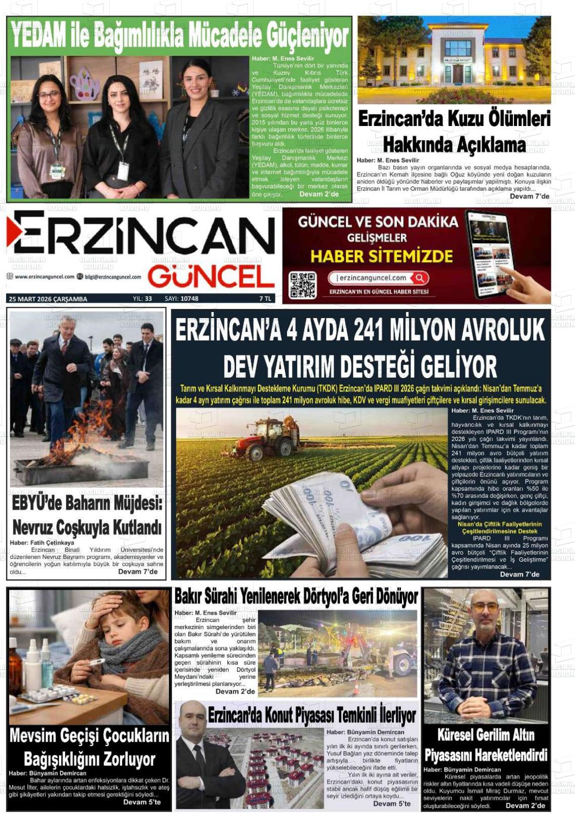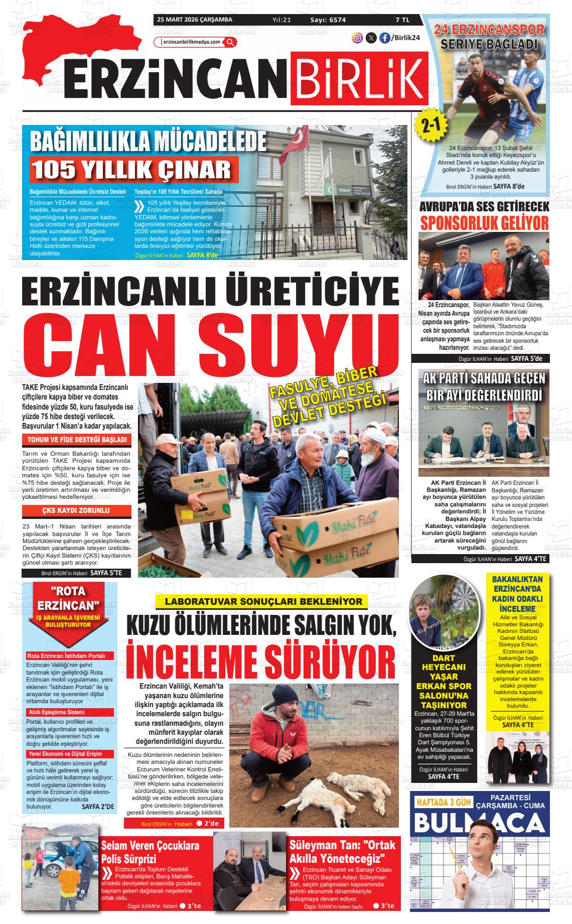 Erzİncan Yerel Gazeteleri 24 Mart 2026, Salı Günü Manşeti